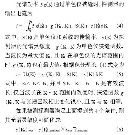 確定校準燈光譜分布時, 需考慮輻射源的光譜范圍。若將兩個儀器的光譜直接比較, 則不必考慮光譜選擇儀器的光譜傳輸率。確定被測燈的光譜分布方法與用已知標準探測器的光譜響應(yīng)率確定另一未知探測器的光譜響應(yīng)率相同。